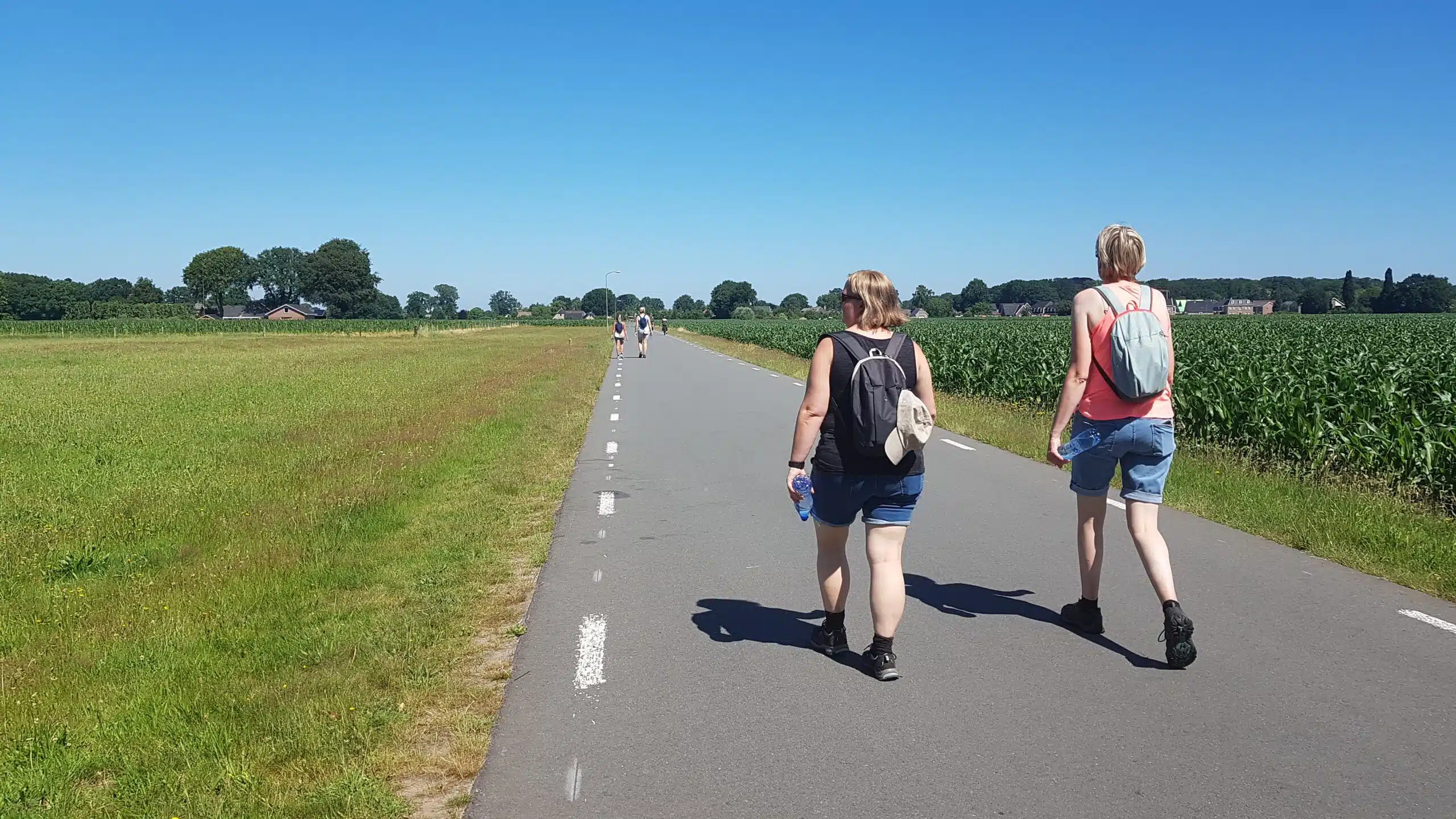 Na de lunch merkten we allemaal wel dat het wandelen wat zwaarder begon te worden. De temperatuur was inmiddels gestegen naar 34 graden (maar de gevoelstemperatuur was nog veel hoger) en de beschutting was soms ver te zoeken. We liepen namelijk op asfalt langs maisvelden. Gelukkig stonden er af en toe sproeiers langs de weg zodat we in de nevel konden staan en onze handdoekjes konden natmaken. Gelukkig hadden we ons allemaal opnieuw ingesmeerd met factor 30 waardoor we goed beschermd waren. Ook de petjes waren geen overbodige luxe. Ik was superblij dat ik nog een tweede paar schoenen en sokken had meegenomen. Van tevoren twijfelde ik daar enorm over, maar ik had geen betere keuze kunnen maken.